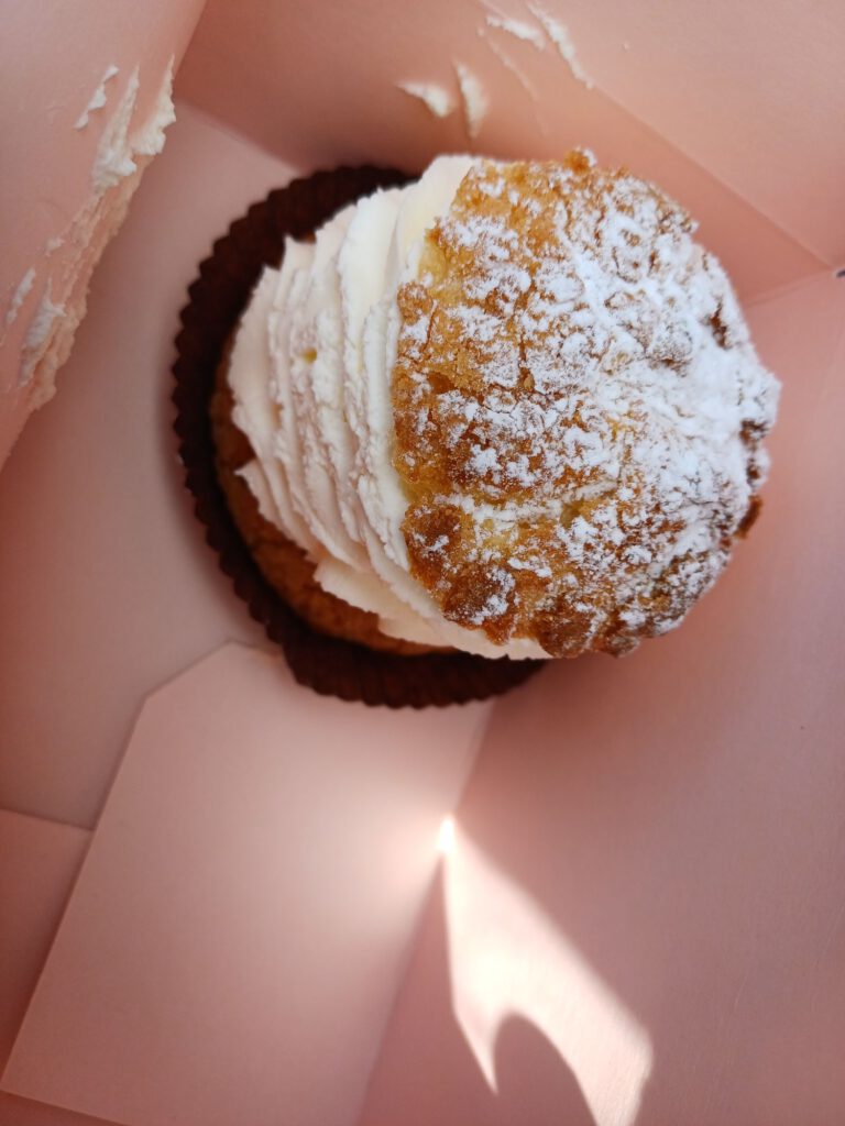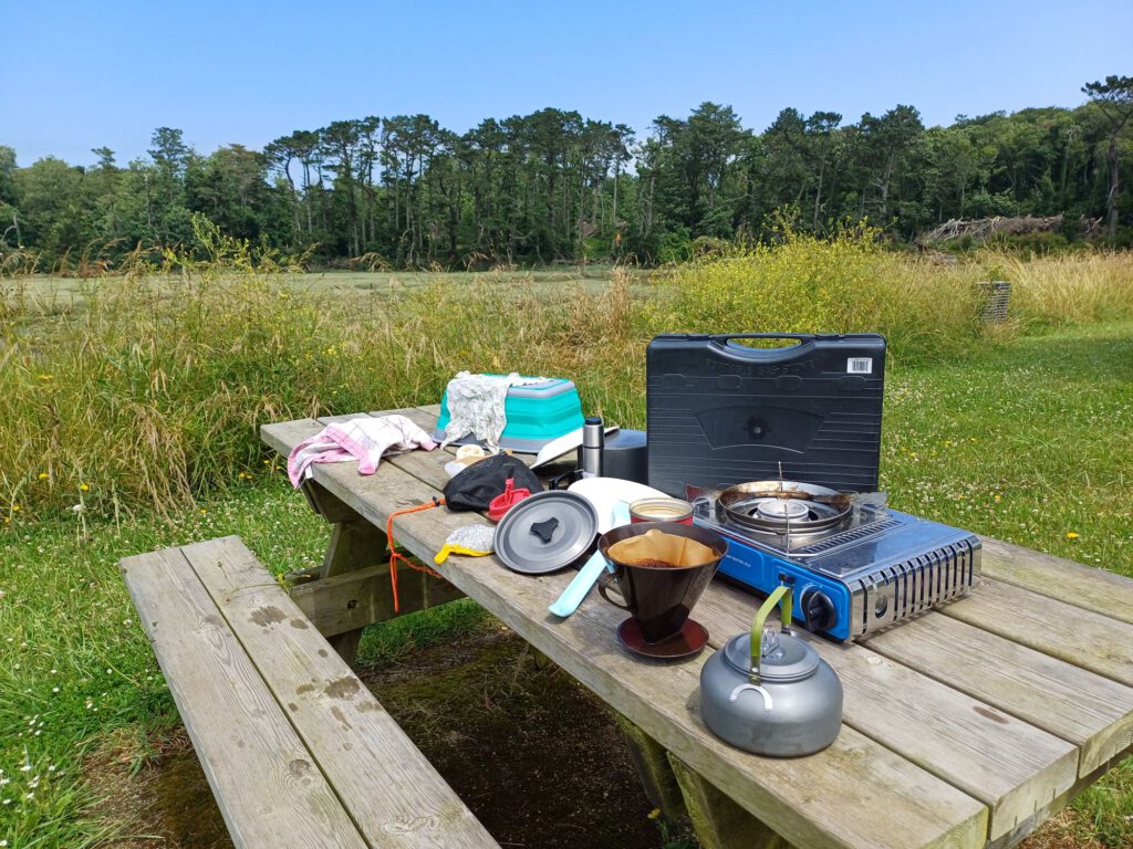 Kurz nach der Pause war dann plötzlich die Energie weg. Also habe ich mich zurück zum Parkplatz geschleppt. Der war mittlerweile rappelvoll. Da ich eine Pause und eine Toilette brauchte, bevor ich weiterfahren konnte und der Backofen Yoggi nicht sehr verlockend war, bin ich in die Crèperie gegenüber dem Parkplatz gegangen. Bei einem Cappuccino und einem leckeren hausgemachten Eis, habe ich nach möglichen Parkplätze für die Nacht geschaut. Mittlerweile ist der Yoggi etwas durchgelüftet und die Powerstation fast voll. Es kann weitergehen.