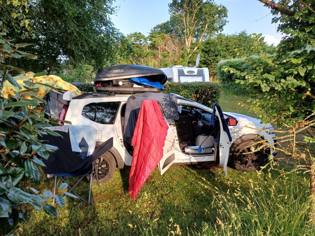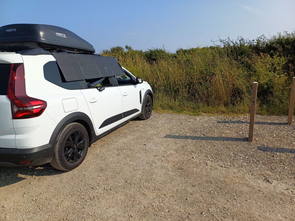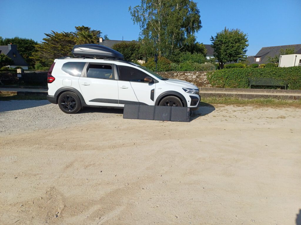 Das Navi hat auch auf dem Weg nach Morgat wieder seltsame Dinge gemacht. Wenn ich wieder zuhause bin, muss ich mal schauen, ob es dafür ein Update gibt. Nachdem ich es endlich nach Morgat geschafft und auch irgendwann einen Parkplatz ergattert habe, habe ich ein wenig „Haushalt“ gemacht (aufgeräumt, Geschirr gereinigt,…) und das Solarpanel rausgehängt. Viel Strom gab es nicht (bewölkt) aber besser als nichts. Hier an meinem heutigen Schlafplatz scheint gerade die Sonne, da kann die Powerstation noch auftanken.