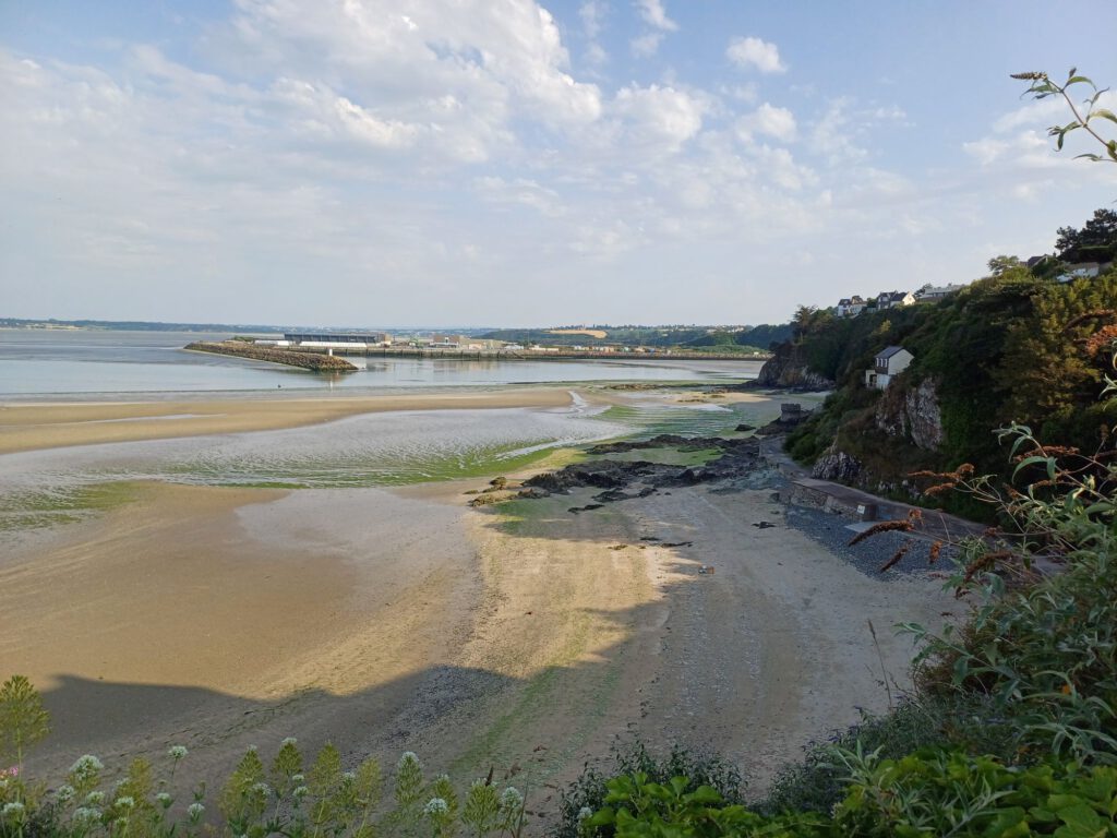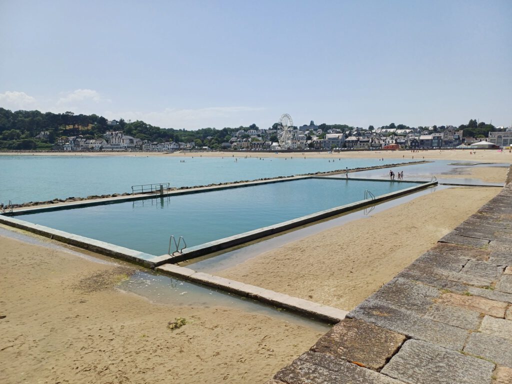 Entlang des Sable Blanche ging es weiter Richtung Leuchtturm und les Bernains. Zu Beginn hat mich ein Regenschauer erwischt, aber am Hafen brannte mittlerweile die Sonne glühend heiß. Es hatte um die 30°C. Da mir die Anstrengung vom Vortrag noch in den Knochen steckte und ich den ganzen Tag schon einen ziemlich hohen Puls hatte, wollte ich mir statt Strand ein schattiges Plätzchen suchen. Auf der Karte habe ich einen Park entdeckt und dachte, dort würde sich ein Plätzchen finden, wo ich meine Decke ausbreiten und mich hinlegen könnte. Außerdem solle dort in der Nähe eine archäologische Ausgrabungsstätte sein. Dazu musste ich rund 1km durch die Stadt und dann einen kurzen, aber knackigen Anstieg bewältigen. In dem Park, der genaugenommen eine Mischung aus Wäldchen und Wiesen war, waren die Wiesen nicht gemäht und die paar Sitzgelegenheiten, die es gab, waren alle in der Sonne. Kein geeigneter Ort für eine Ruhepause. Da ich auch die Ausgrabungsstätte nicht finden konnte und mir die Hitze immer mehr zu schaffen machte, beschloss ich umzukehren und mir die Kirche Notre-Dame de Bon Voyage anschauen und dort etwas auszuruhen. Aber bereits nach wenigen Metern merkte ich, dass mir das zuviel wird. Daher bin ich den kürzeren Weg zum Auto gegangen. Das war zwischenzeitlich der reinste Glutofen. Daher beschloss ich es doch mit einer Abkühlung im Wasser zu versuchen. Es gibt in Binic am Plage Blanche ein Gezeitenbecken, das sich bei Flut mit frischem Meerwasser füllt. Es soll eines der schönsten in der Bretagne sein.