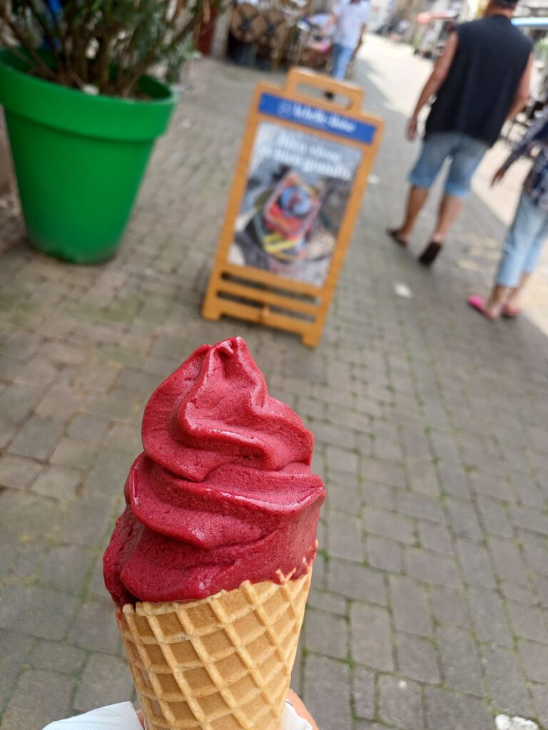 Tatsächlich hat die Abkühlung meine Lebensgeister wieder geweckt. Nachdem das klebrige Salzwasser wieder von der Haut gewaschen war, habe ich mich fast wie neugeboren gefühlt. Das Glück perfekt gemacht hat dann ein Glace italienne (eine Art Softeis) der Geschmacksrichtung Cassis.