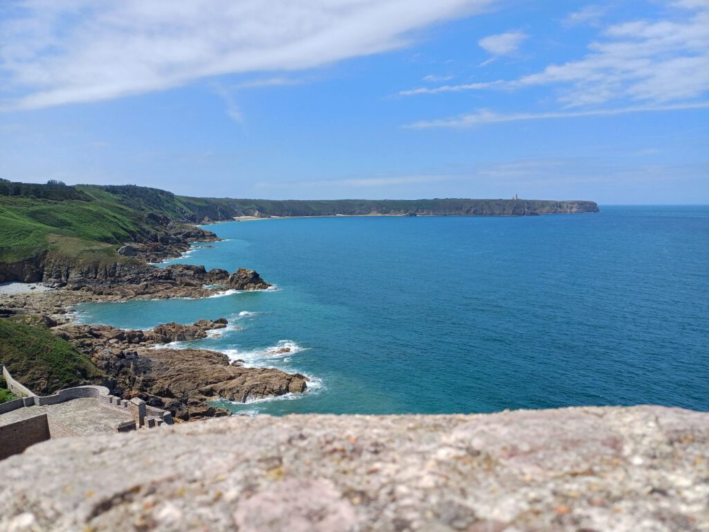 Blick von Fort La Latte Richtung Cap Fréhel mit Leuchtturm