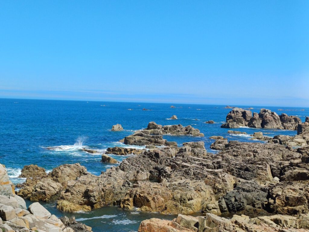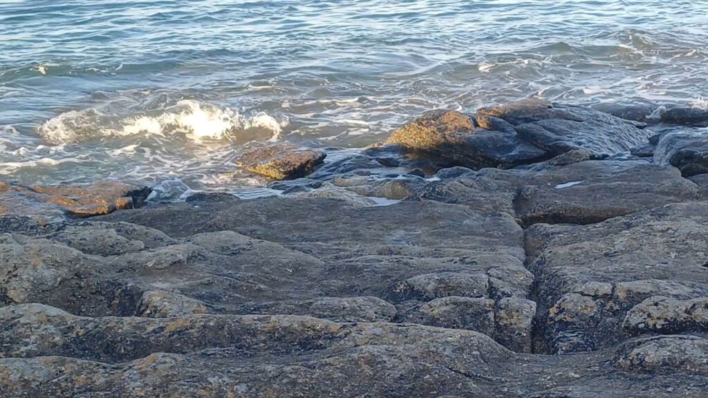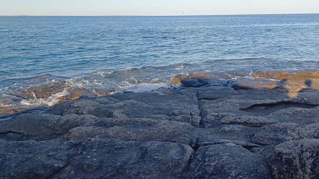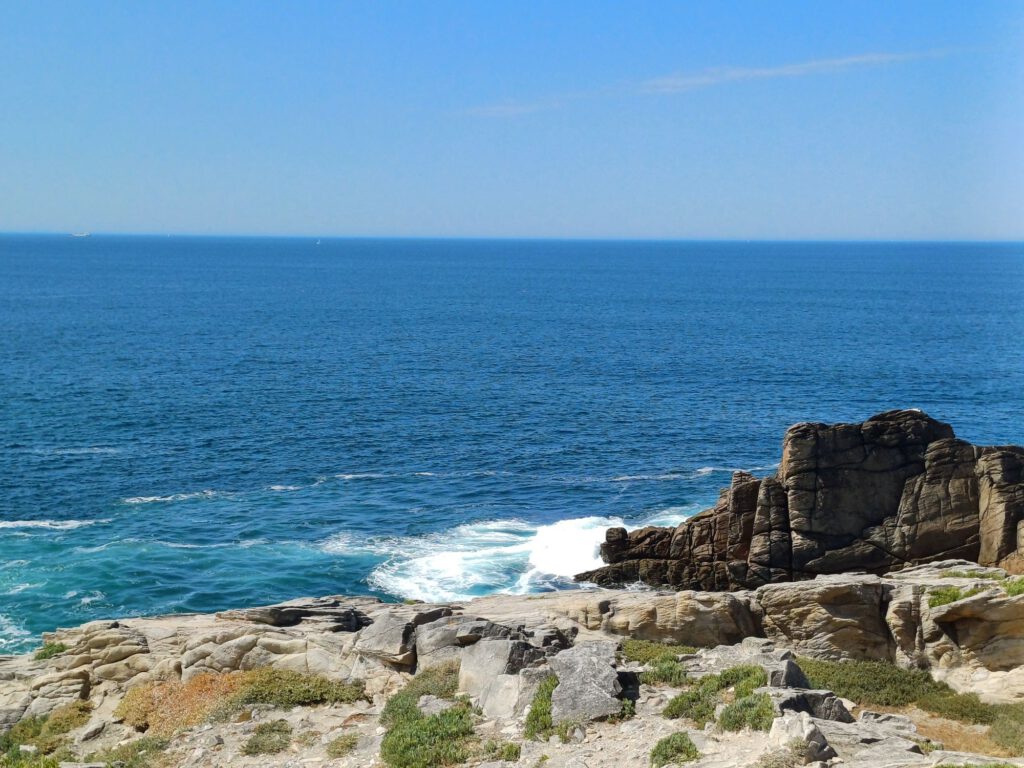 Da es immer noch sehr heiß war, haben wir uns auf den Weg Richtung Ende der Landspitze gemacht. Diese ist nur zu Fuß erreichbar und auf dem Weg gab es Bänke im Schatten eines Kiefernhains, wo wir uns mit Blick auf das Meer und einem Snack aus Obst und Nüssen stärken konnten. Als die Sonne nicht mehr so hoch stand haben wir unseren Weg fortgesetzt und uns an der Spitze der Landzunge auf einen Felsen gesetzt und die nahende Flut beobachtet.