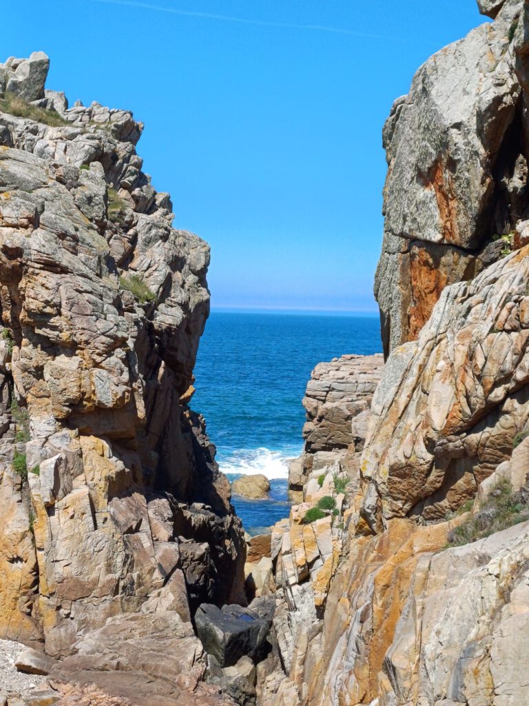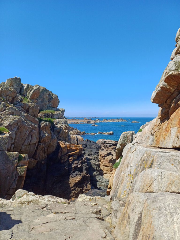 Gleich daneben befindet sich ein weiterer Touristenmagnet der Le gouffre (Schlucht) de Plougrescant,ist eine Klippe mit einem tiefen Einschnitt. Die Bucht wird auch als Höllenbucht bezeichnet. Als wir dort waren, war Niedrigwasser und schönster Sonnenschein. Angeblich sollen bei stürmischen Wetter Wind und Wellen durch den Spalt brechen, was die Kraft und Urgewalt des Ozeans deutlich demonstriert.