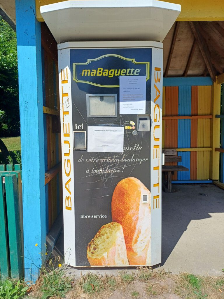 Eine Stunde später sitzen wir gemütlich beim Frühstück, das Solarpanel lädt die Powerstation und wir genießen frisch gebackenes Baguette, mit dem die freundliche Bäckerin gerade den Automaten aufgefüllt hat. Hier kann man nämlich 24/7 frisches Baguette aus dem Automaten bekommen.