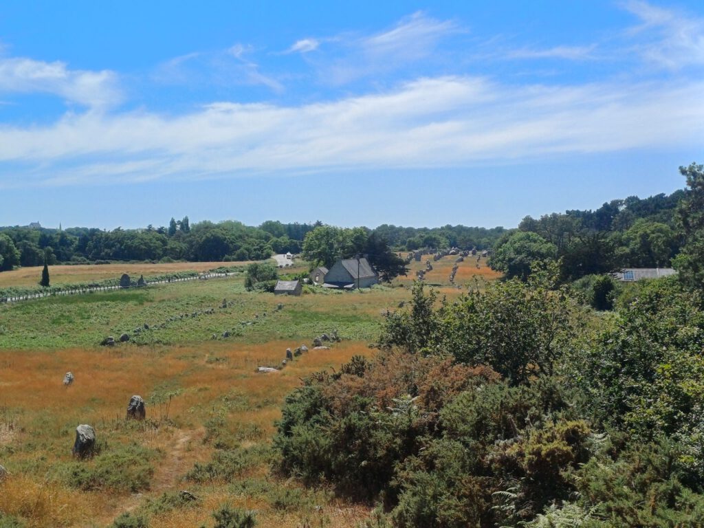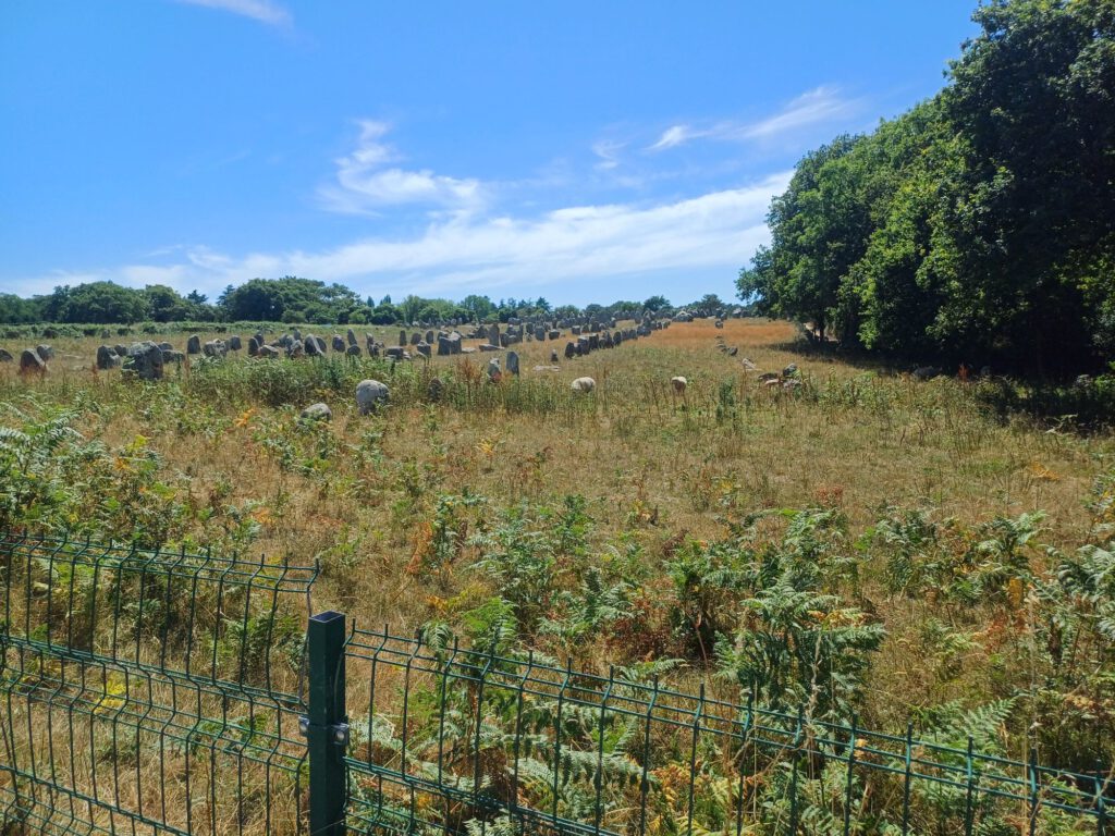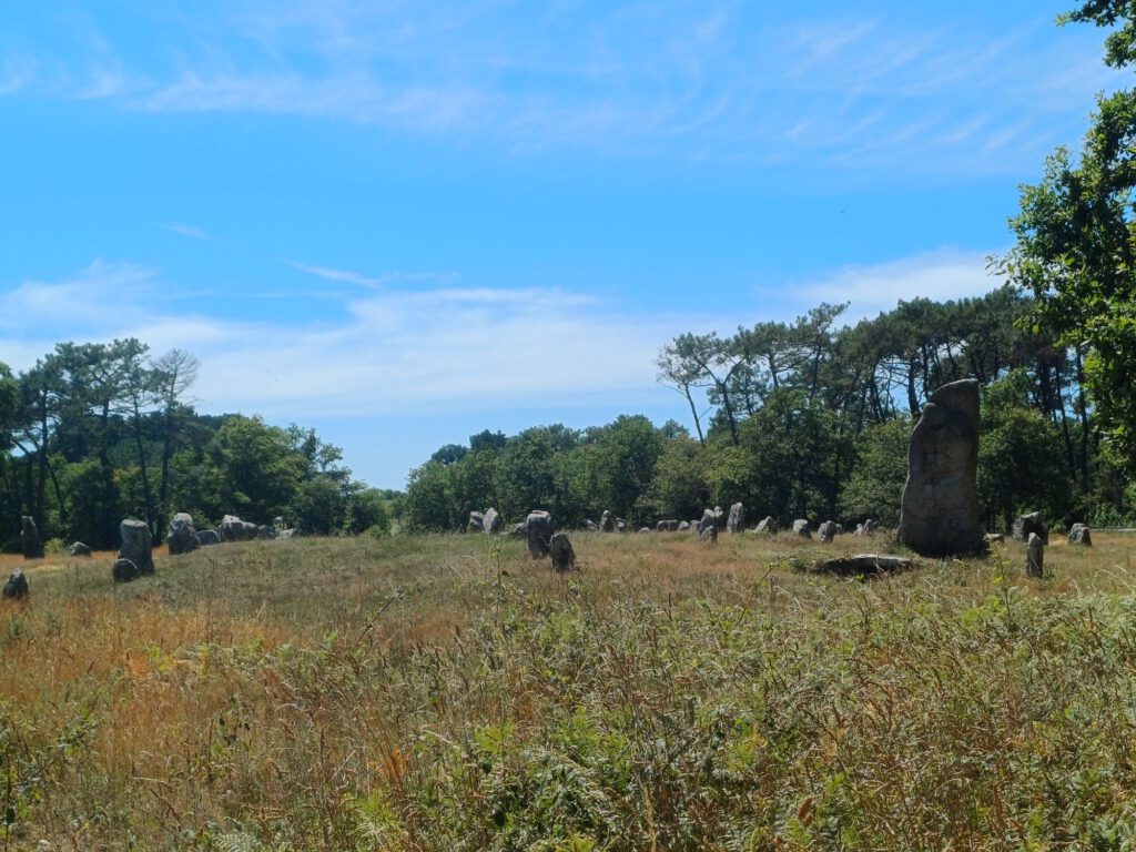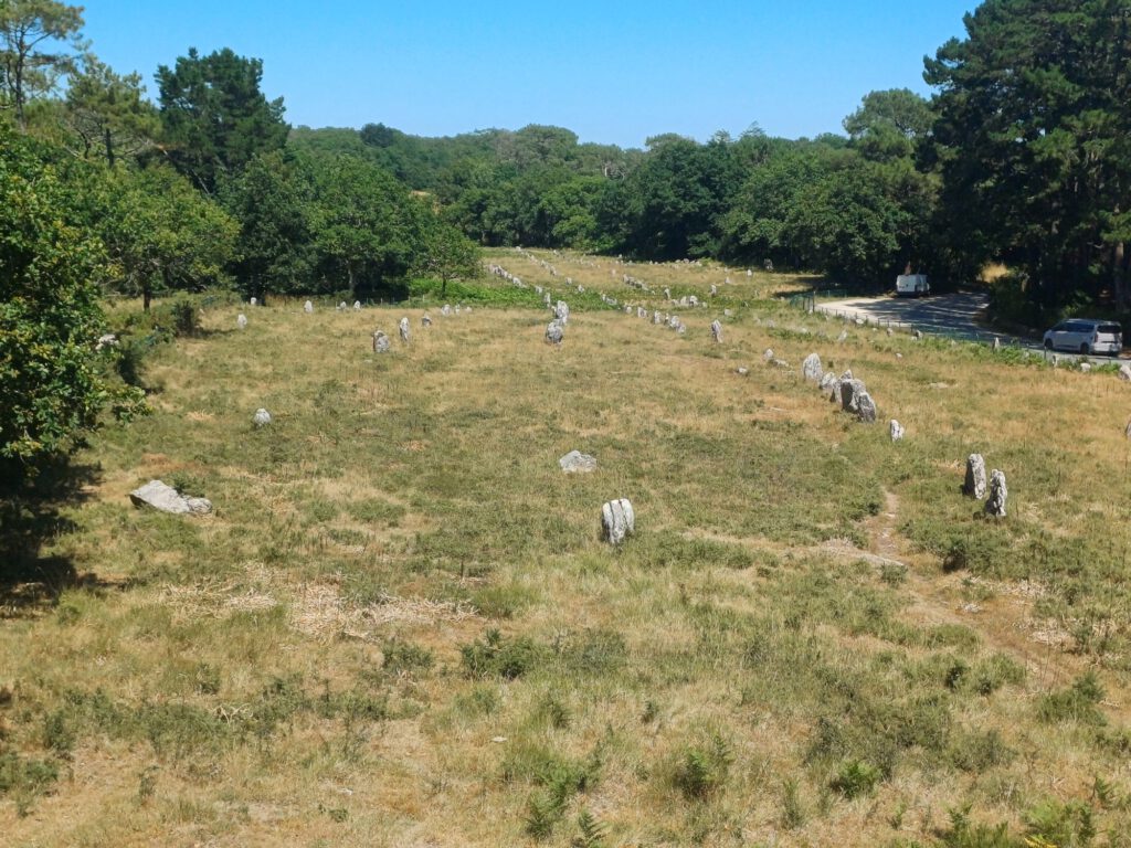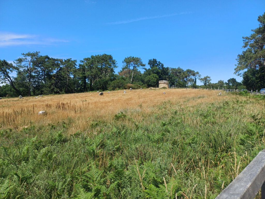 In der Nähe von Carnac haben wir eine Wanderung zu verschiedenen Megalithkultur-Stätten gemacht. Der erste Teil entsprach der Wanderung, die ich bereits vor einigen Wochen zum begehbaren Tumulus von Kercado und zum Géant du Manio gemacht hatte. Der neue Teil führte uns zu den Steinreihen und zum Tumulus von Manio. Dort hatten wir das zweite Auto geparkt. Es war so heiß, daß man selbst im Sitzen ohne sich zu bewegen geschwitzt hat. Kaum auszuhalten.