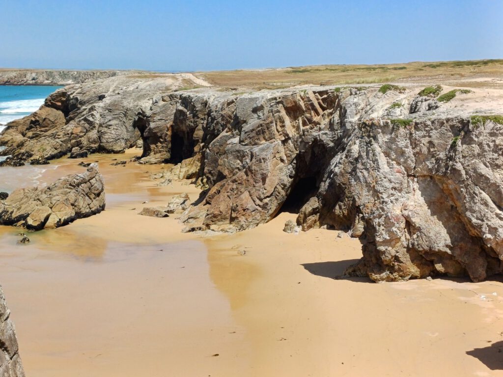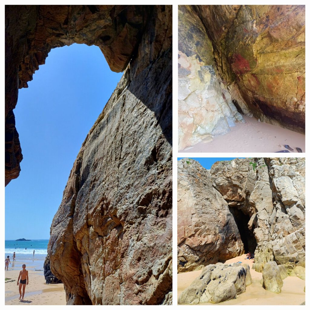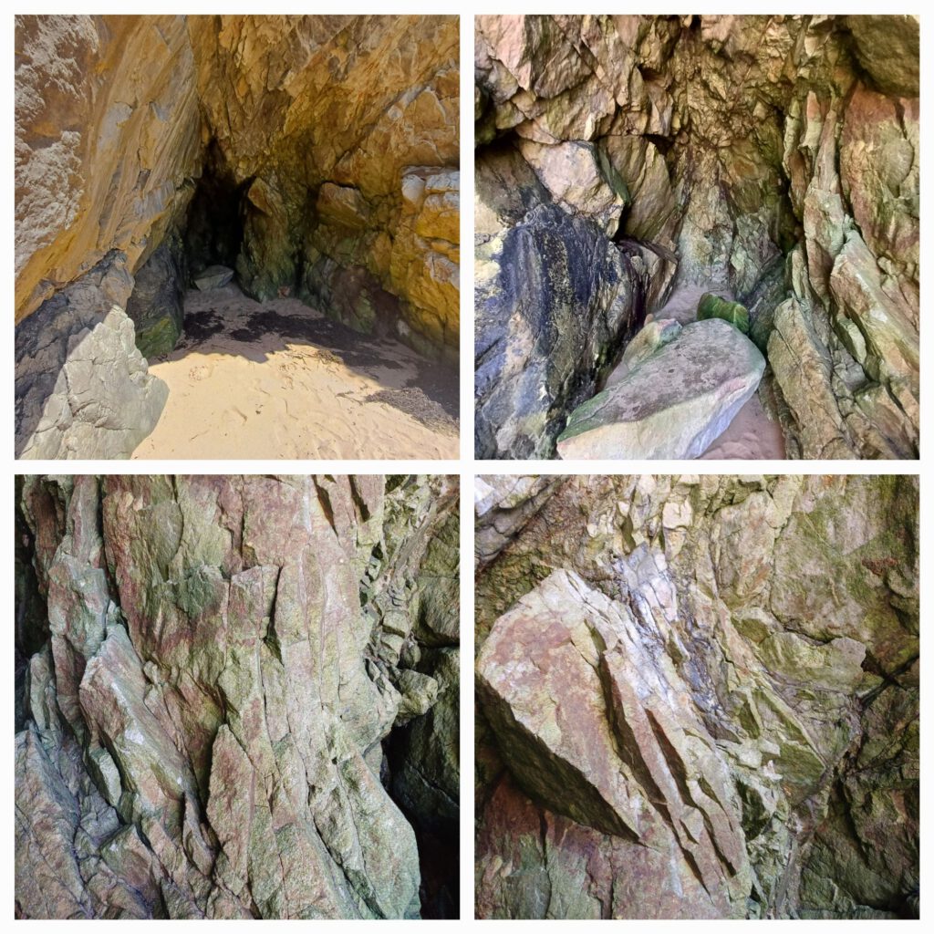 An einem der nächsten Strände gab es Höhlen, die auf Fotos sehr groß wirkten. Wie wir schon vermutet hatten, sind sie nur bei Ebbe zugänglich. Wir waren leider kurz nach Hochwasser dort und konnten nicht ganz bis zu den Höhlen vordringen. Nur von der Klippe darüber einen Blick auf die Höhleneingänge werfen. Da wir spätestens um 18 Uhr auf dem Campingplatz sein mussten, konnten wir nicht warten, bis die Ebbe den Zugang weit genug freigegeben hätte. Unterwegs hatten wir von den Klippen aus gesehen, dass es am Plage Port Blanc auch Höhlen zu geben schien. Die haben wir uns dann als Trostpreis angesehen. Sie waren nicht ganz so spektakulär, aber man konnte immerhin mehrere Meter hineingehen.