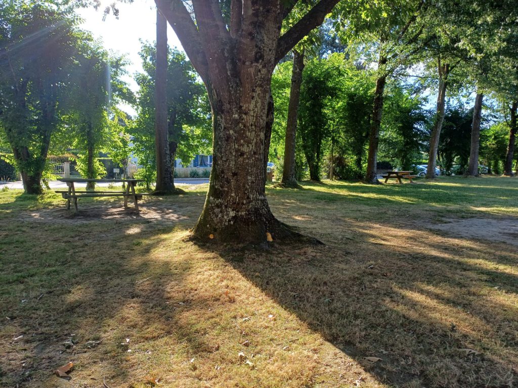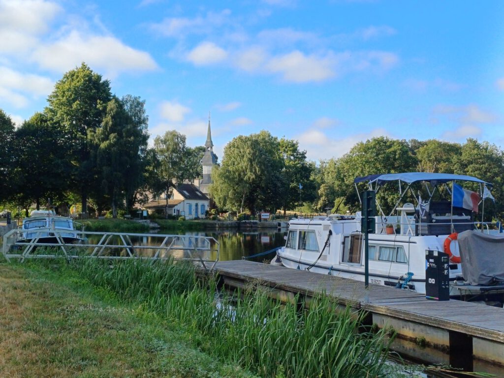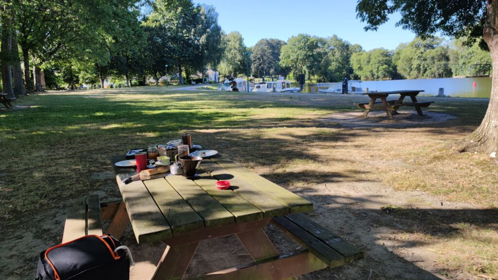 Danach sind wir zu einem Ort gefahren, an dem wir übernachten wollten. Er liegt im Landesinnern an einem Kanal. Damit haben wir etwa die halbe Strecke zu unserem morgigen Ziel in der Umgebung von Carnac bereits hinter uns gebracht. Allerdings war es hier mit knapp 30° viel heißer als wir es von der Küste gewohnt sind.