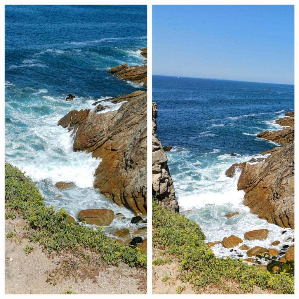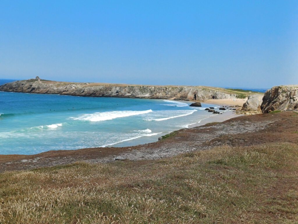 Nach einem gemütlichen Frühstück und ausgiebigen Lüften, fuhren wir nach Saint-Pierre-Quiberon. Unzerwegs gab es einen Zwischenstopp, um frisches Brot, obst, Gemüse und v. A. Wasser zu besorgen. Bei der Hitze ist der Bedarf doch deutlich höher. Wir haben eine Miniwanderung über Pointe du Percho und am Strand Plage Port Blanc entlang. Neben einer Ruine, zu der es keine weiteren Infos gab, gab es einen Dolmen und viele Wellenreiter. Wir waren nämlich in einem El Dorado für Surfer gelandet. In Pléhérel bei unserer Ferienwohnung fanden wir ja die Wellen mit 1m Höhe toll, aber das hier war eine ganz andere Hausnummer. Hier waren die Wellen mehrere Meter hoch. Es schäumte und spritzte nur so, wenn sie sich am Strand und den Klippen brachen. Wir hatten mindestens so viel Freude daran sie zu beobachten, wie die Surfer, sie zu reiten.