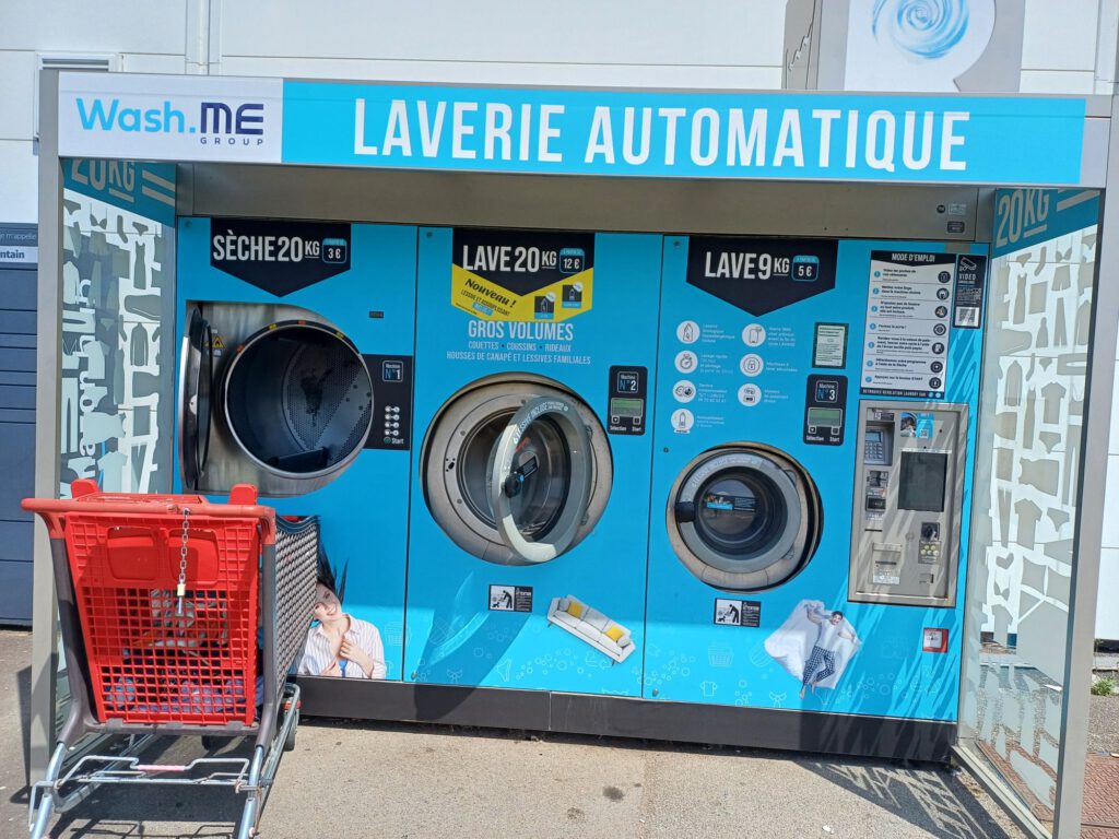 Samstag: nach einer feucht-heißen Nacht, war der Morgen etwas kühler, aber immer noch sehr drückend. Die Hitze hatte auch dazu geführt, dass die Kühlbox Höchstleistungen bringen musste und die Powerstation geleert hat. Das Wetter war aber nicht geeignet, Solarstrom zu bekommen (bewölktundimmer wiederRegen). Daher konnte ich auch den für morgens geplanten Wochenendeinkauf nicht machen. Bei den Temperaturen wäre mir der Käse durchs Auto gelaufen. Nach der erfolglosen Suche nach einem hübschen Picknickplatz, bin ich Wäsche waschen gegangen. Das hat überraschend gut geklappt. Ich habe zu den Waschmaschinen und Trocknern, die man in Frankreich oft vor Supermärkten findet, schon einiges gehört. Von himmelhochjauchzender Begeisterung bis „funktioniert gar nicht“ war alles dabei.