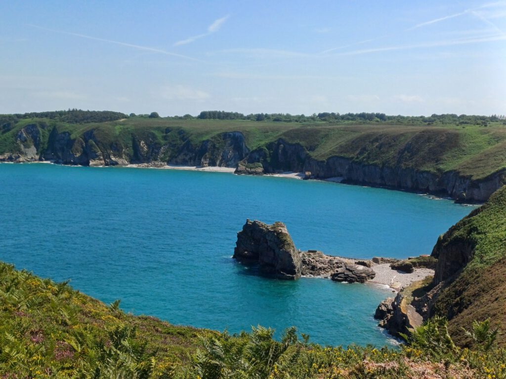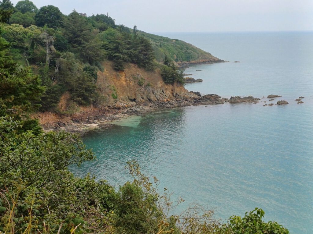 Meist ging es über Stock und Stein, aber es gab auch vereinzelt sehr bequeme Wege……oder ein kostenloses Gorse-Peeling für die Schienbeine und Waden. Und wieder jede Menge Treppen Die Côte d’Émeraude (Smaragdküste) trägt ihren Namen zurechtAn diesem schönen See ist das Unglück mit dem Schuh passiert, dabei war das ein absolut traumhafter Ort