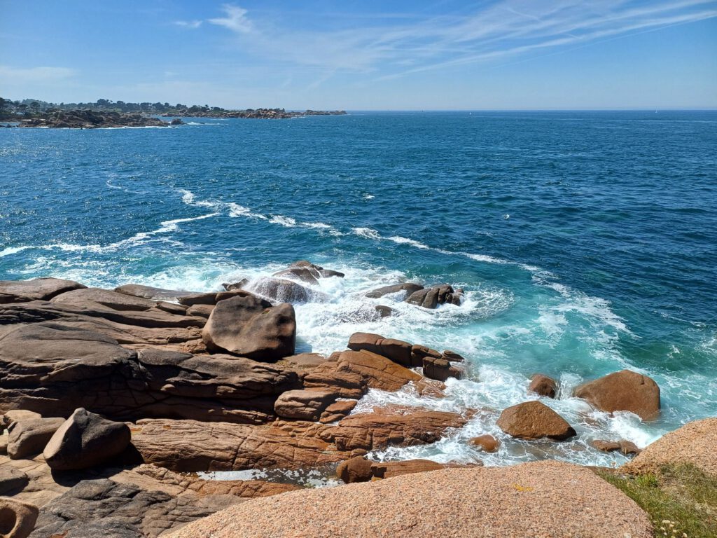 Obwohl es nur rund 22°C hatte, fühlte es sich bei strahlendem Sonnenschein und wolkenlosem Himmel sehr warm an. Daher waren wir sehr froh eine Bank im Schatten mit Blick über die Bucht auf Perros-Guirec zu finden und uns bei einem kleinen Picknick zu stärken.
