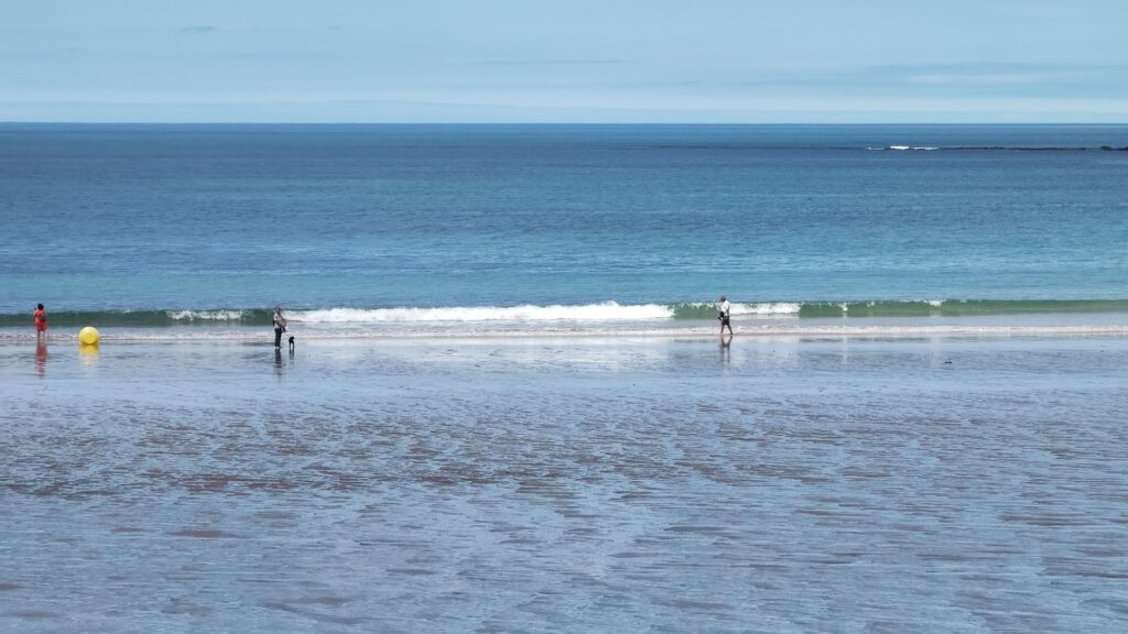 Nachmittags waren wir nochmal am Strand, haben uns von den teilweise gut 1m hohen Wellen treiben und herumwerfen lassen und vom Strand aus aufs Wasser geschaut. Man muss es ausnutzen, wenn man nur über die Straße muss, um an den Strand zu kommen.