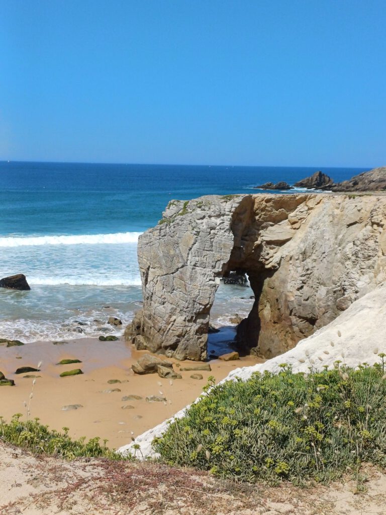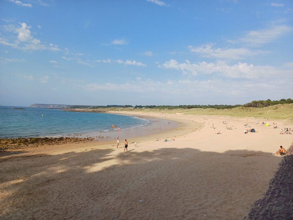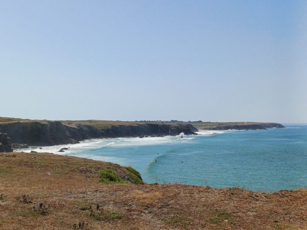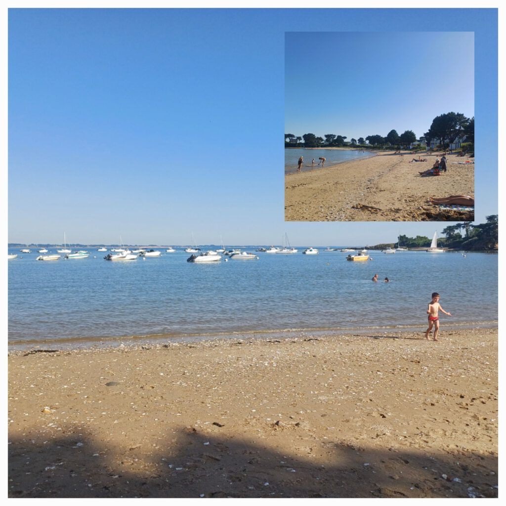 Ich war mittlerweile auch wieder ziemlich am Limit mit meiner Kraft. Nicht nur körperlich. Auf einer Picknickbank im Schatten haben wir eine Pause gemacht und geschaut, wo wir die kommende Nacht verbringen können. Eine Dusche wäre schön gewesen, aber in der Region, in die wir wollten, gab es nichts (Campingplatz)… zumindest nichts, was man kurzfristig oder nur für 1 oder 2 Nächte buchen können hätte. Also entschieden wir uns für die Pointe de Conguel am Ende der Quiberonhalbinsel. Dort erhofften wir uns etwas Wind und mildere Temperaturen. Zumindest das mit dem Wind hat hingehauen. Morgen wollen wir uns einen Felsbogen an der Küste der Quiberonhalbinsel anschauen.