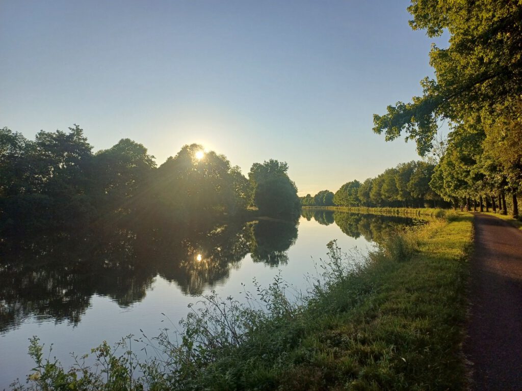 Ein neuer Tag beginnt. Die Sonne scheint schon und bereits um halb neun sind es 20°C. Das Leben hier am Kanal erwacht langsam. Die ersten Gassigänger, Wanderer kommen vorbei und die Bootsbesitzer kommen aus ihren Kabinen. Gestern Abend war es noch ziemlich lange sehr heiß im Auto. Mit offener Tür lagen wir bis mindestens Mitternacht wach. Dann waren es immerhin „nur“ noch 26°C im Auto. Wobei es sich bei 2 Personen noch schneller wieder aufheizt als bei einer. Auch andere Unterschiede zum Solo-Microcampen fallen mir auf. Normalerweise hätte ich jetzt schon das Solarpanel aufgebaut und angeschlossen. Aber ich wollte beim Aufstehen so wenig Aufstand wie möglich machen, damit mein Freund noch ein wenig weiterschlummern kann.