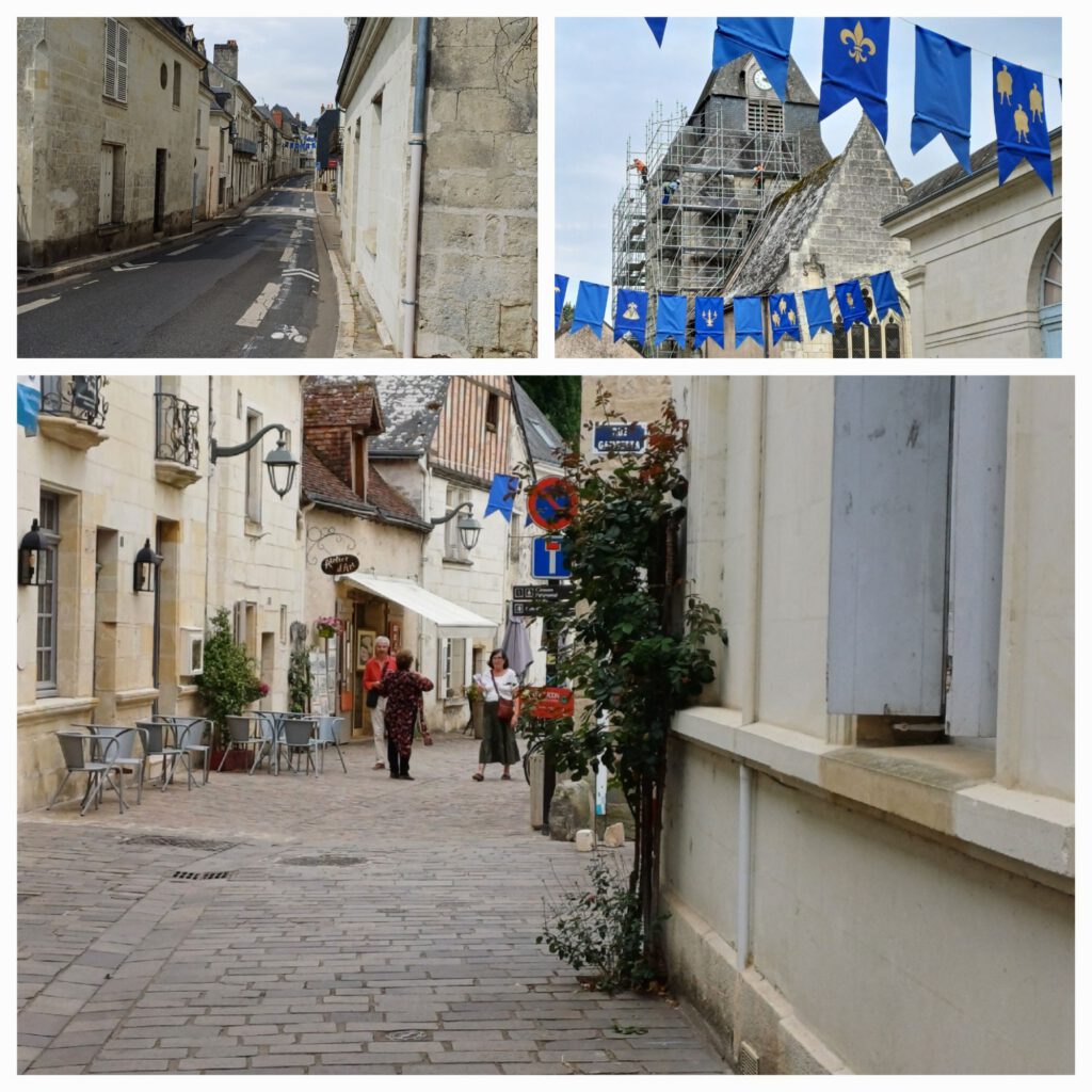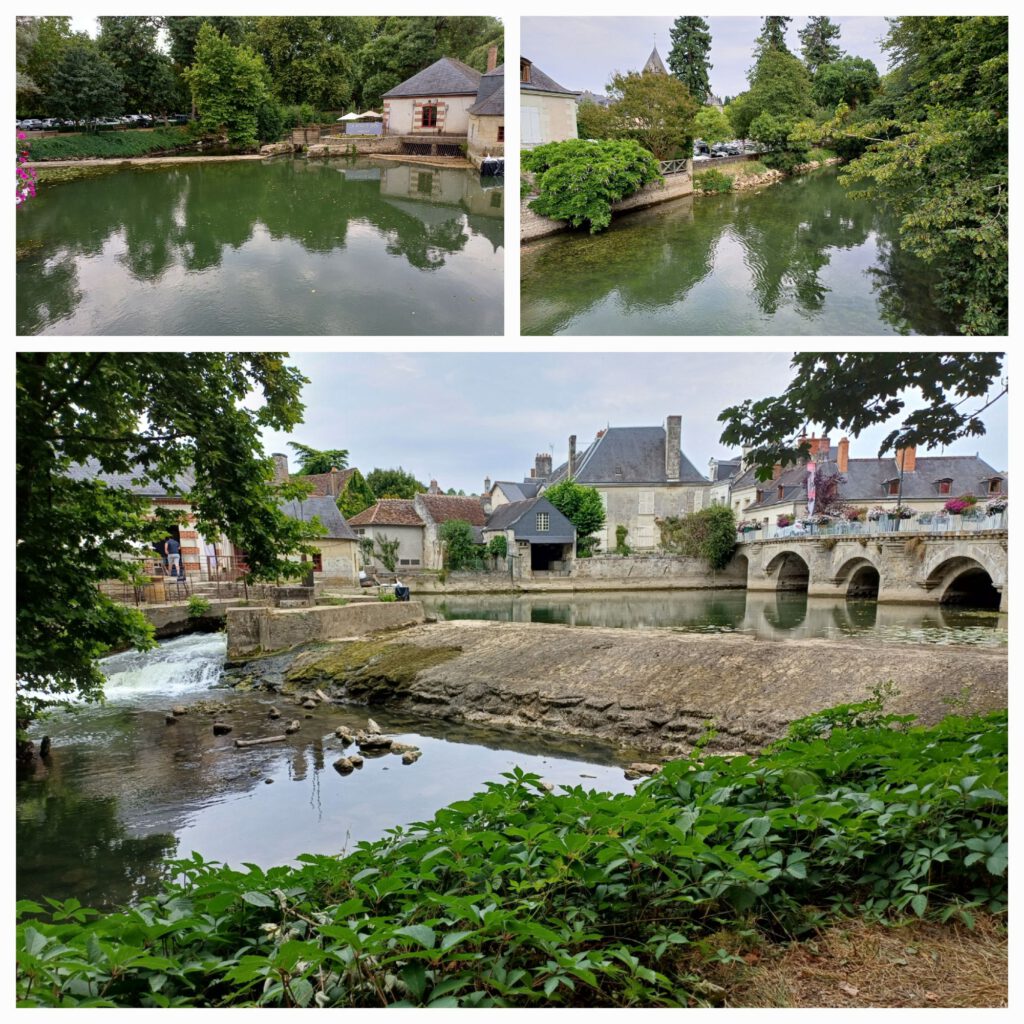 Auf etwa halber Strecke zu meinem heutigen Etappenziel habe ich in einem hübschen alten Städtchen eine längere Pause gemacht. Obwohl ich alle Stunde einen kleinen Halt eingelegt habe, war ich sehr erschöpft. Nachdem ich mir mehr Wasser besorgt hatte fand ich einen schattigen Parkplatz am Ufer eines Flusses mit einem kleinen Wasserfall. Es war zwar so schwül-warm, dass der Schweiß ran, wenn man nur irgendwo saß, aber wenigstens ging ein leichtes Lüftchen. Nachdem ich eine Kleinigkeit gegessen hatte, um den Blutzucker anzuheben, beschloss ich einen kurzen Spaziergang zu machen, um auch den Kreislauf in Schwung zu bringen und wieder etwas wacher zu werden.