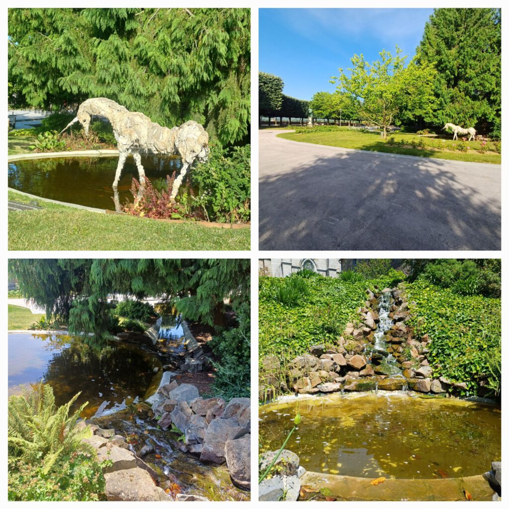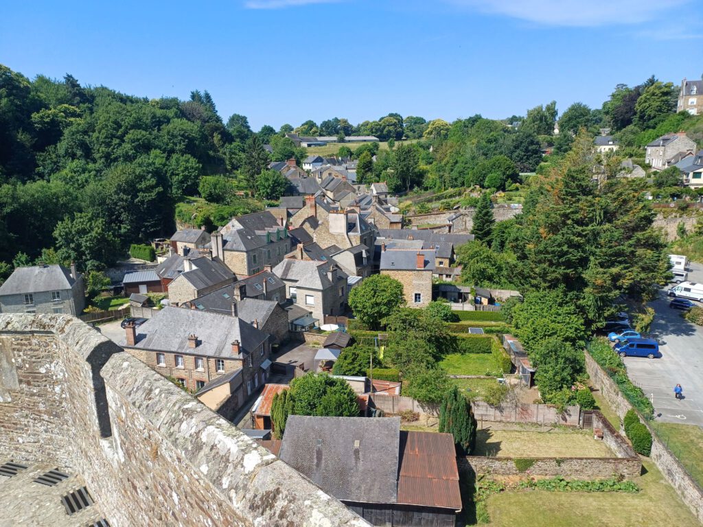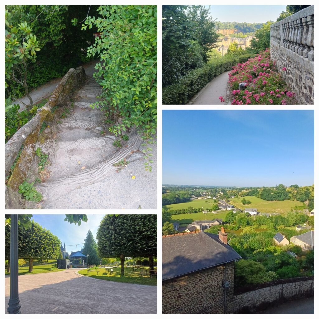 Und ich war früh in Fourgères. Das war auch aus mehreren Gründen gut. Als ich mich vom Parkplatz auf den  Weg zum Chateau machen wollte, habe ich nämlich bemerkt,  dass der Kofferraum nicht zu war. Das verrückte war. Egal welche Knöpfe ich auf der Fernbedienung drückte,  entweder war der Kofferraum auf und die Türen verriegelt oder andersrum. Nachdem ich alle Wertsachen aus dem Auto in meinen Rucksack umgepackt hatte und die ersten 1-200m Richtung Chateau und mittelalterliches Zentrum gelaufen bin, kam mir noch die Idee, dass es funktionieren könnte,  wenn ich keyless Entry wieder aktiviere. Das hatte ich vor 2 Wochen abgestellt,  als ich Probleme mit der Batterie hatte. Weil das Auto ständig auf und zu ging, wenn ich irgendwo stand und mit der Schlüsselkarte in der Tasche ums Auto herum unterwegs war. Und tatsächlich, wenn ich das Auto automatisch verschließen lasse, sobald der Schlüssel sich entfernt, dann sind alle Türen inkl. Kofferraum verriegelt.  Ich vermute eine Fehlprogrammierung. Also konnte ich mich jetzt beruhigt auf zur Festungsbesichtigung machen. Da ich am oberen Eingang des Jardin Publique geparkt hatte, durfte ich als erstes den Ausblick von der obersten Ebene des Gartens genießen. Er liegt an einem ziemlich steilen Hang und ist in drei thematisch unterschiedliche Bereiche aufgeteilt. Wirklich sehr schön gemacht. Eine gute Mischung aus naturbelassenem und angelegtem Garten mit viel Schatten und Wasser.