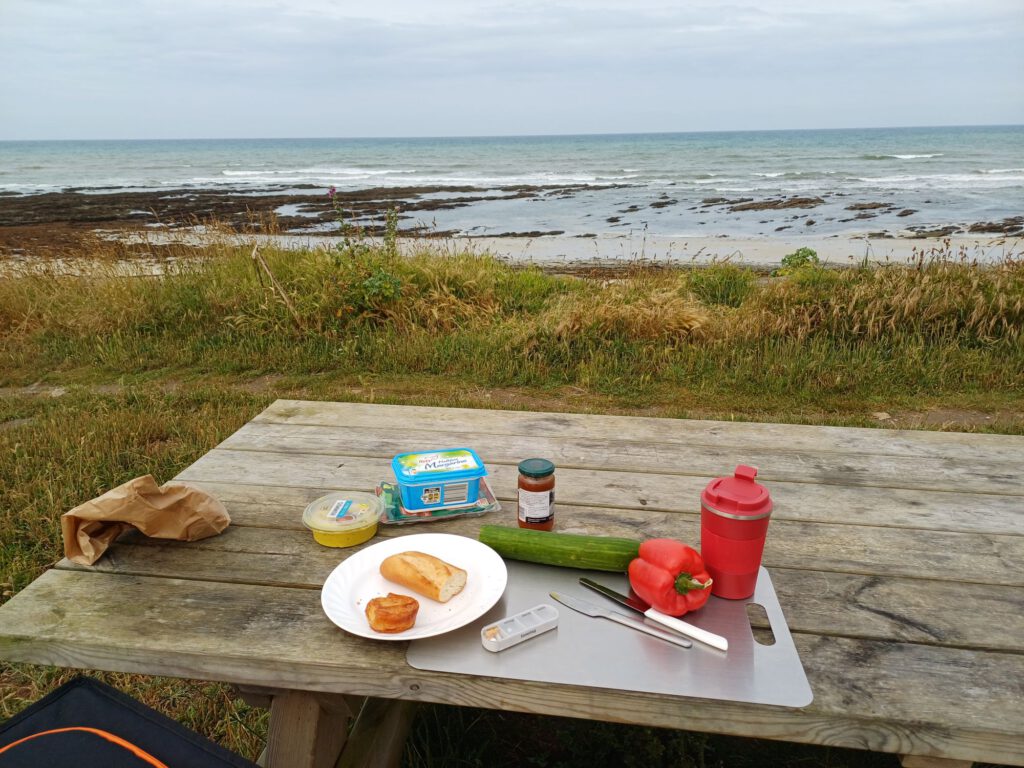 Deshalb habe ich dort eine kleine Mittagspause gemacht und mir überlegt, wie mein Trip weitergehen kann. Die zunehmende Fatigue mit all ihren Begleiterscheinungen hat mir ein bisschen einen Strich durch die Planung gemacht. Ich habe dann entschieden Richtung Fougères zu fahren. Dort gibt es die größte mittelalterliche Burg Europas. Das war eigentlich ein Punkt, den ich nur bei übriger Zeit machen wollte. Normalerweise hätte jetzt noch ein Abstecher in die Normandie auf dem Programm gestanden. Aber bei meinem Zustand erspare ich mir das. So wie ich die letzte 2 Tage gestaltet habe, komme ich gerade so hin. Außerdem wurden kurz vor meiner Abfahrt die Klippen in Étretat gesperrt, weil sich immer wieder Touristen zu waghalsig benommen haben und es zu einigen teils tödlichen Unfällen gekommen ist. Außerdem haben die Besucherströme zu zuviel zerstörter Natur und verstärkter Erosion geführt. Daher kann ich das Vorgehen der Stadt verstehen, auch wenn ich es schade finde.
