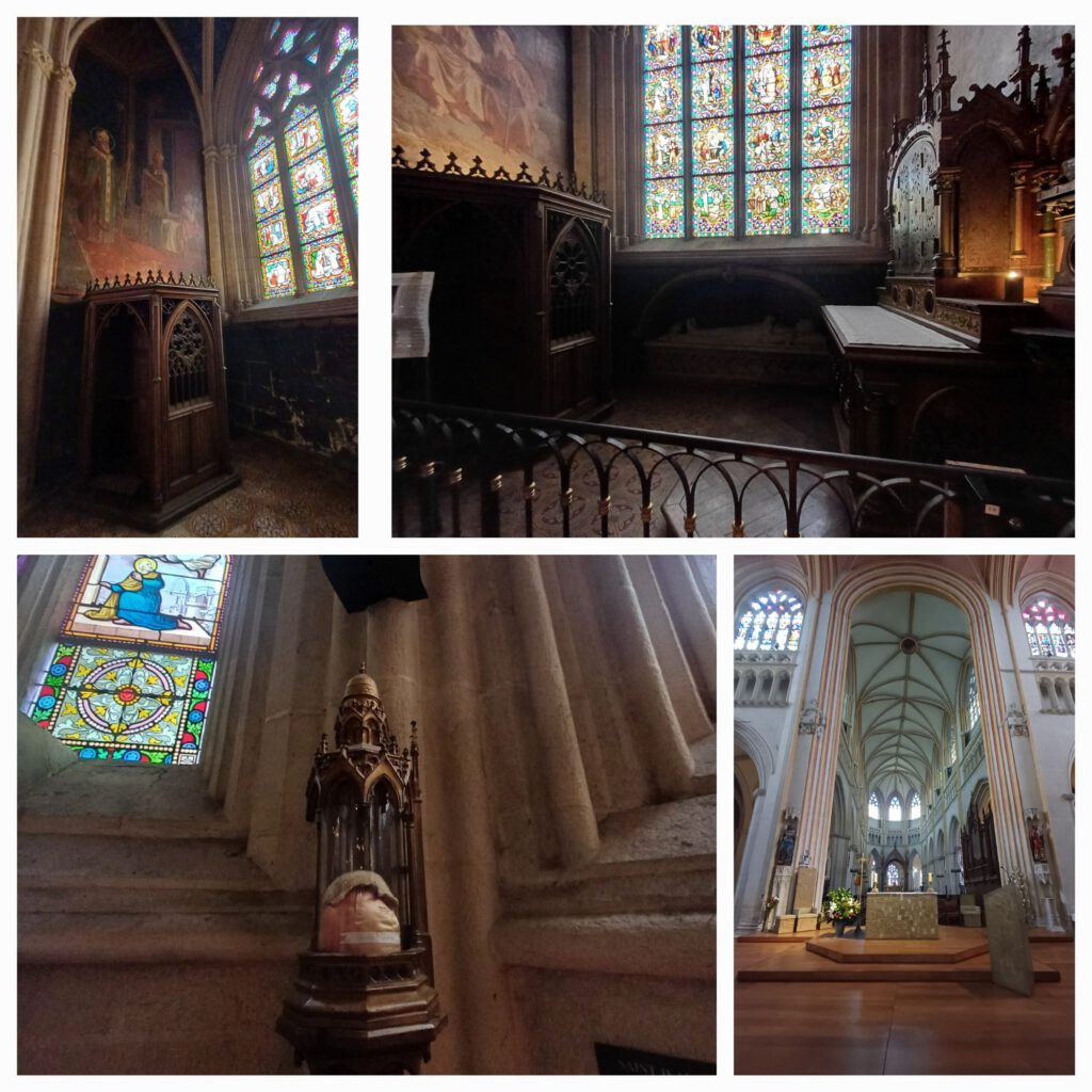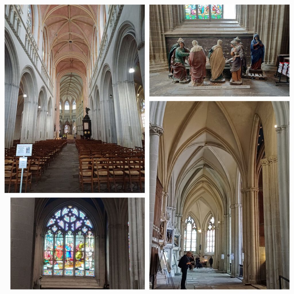 Da ich erst nach 18 Uhr in Tréguier ankam, ging ich davon aus, dass sie schon geschlossen sein würde und ich sie nur von außen besichtigen konnte. Aber sie war noch offen. Ich habe mich sehr beeilt, alles schnell anzuschauen, damit ich nicht schon wieder in einer Kirche eingeschlossen werde. Es gibt 3 Portalvorhallen, durch die man die Kathedrale betreten kann. Im Innern beeindruckt das Kreuzrippengewölbe, das auf ca. 2m dicken Säulen ruht, ebenso wie die vielen Kunstwerke. Es gibt Statuen, Gemälde, Holzschnitzereien, und Steinmetzarbeiten zu bewundern. Mehrere Altäre im Hauptschiff und einigen Nebenkapellen und ein wunderbar gearbeitetes Chorgestühl runden das Bild ab